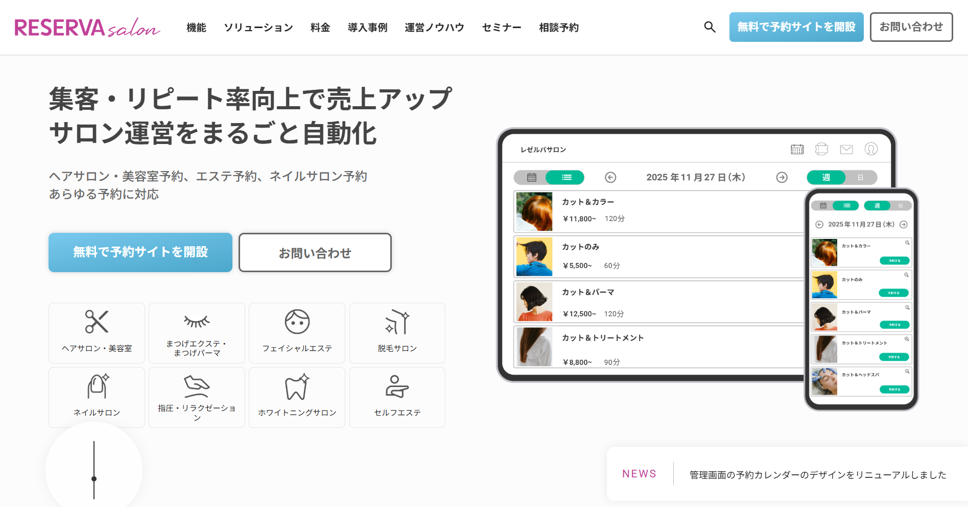 株式会社コントロールテクノロジーは、サロン運営に特化した予約システム総合情報サイト「RESERVA salon」をリリースしました。「RESERVA salon」では、ヘアサロン・美容室をはじめ、エステサロン、ネイルサロン、リラクゼーションサロンなどあらゆる店舗を対象に、予約受付から顧客管理、集客、月額サブスク、データ分析、メルマガ配信にいたるまで、サロン運営にかかる業務の自動化・効率化をサポートいたします。